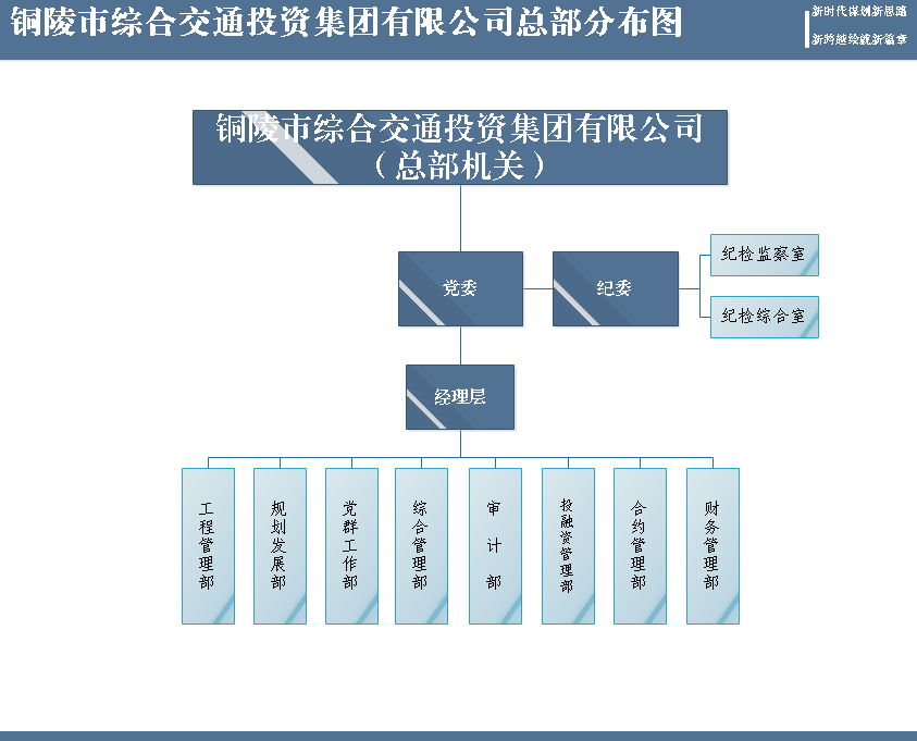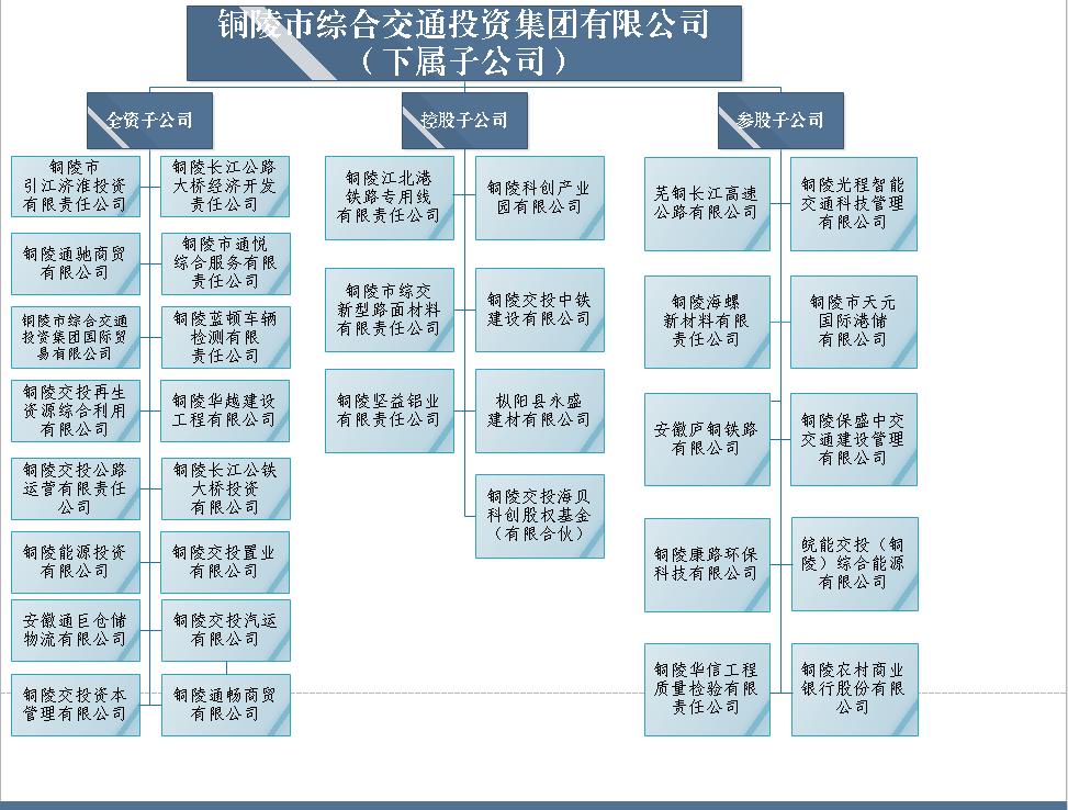 2017年8月18日,市委、市政府立足一江兩岸發展新局面,決定在原市交投公司整體劃轉新體基礎上組建集全市交通基礎設施項目投融資、開發建設和運營管理、參與項目謀劃工作為一體的綜合交通投資集團有限公司。注冊資本金109.77億元人民幣,企業主體信用評級“AA”等級,擁有全資子公司18家,控股公司10家,參股公司11家,是由銅陵市人民政府出資的市屬國有企業。