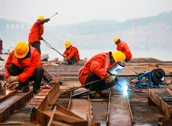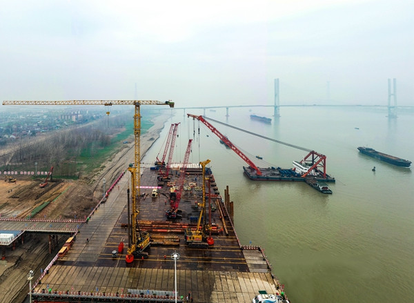 4日上午8時30分,位于長江北岸G3銅陵長江公鐵大橋3號墩的施工現(xiàn)場,上百名橋梁建設者正在進行施工平臺的鋪設和完善,以及鋼護筒的插打作業(yè)。現(xiàn)場塔吊林立,焊花四濺,一派繁忙的景象。中鐵大橋局G3銅陵長江公鐵大橋項目部一分部黨支部書記趙懿告訴記者,目前大型吊船、履帶吊、塔吊、旋挖鉆機等大型設備已經(jīng)到位,“2022年,我們計劃實施橋墩鉆孔樁、承臺、墩身等施工,年度計劃投資10億多元?!?