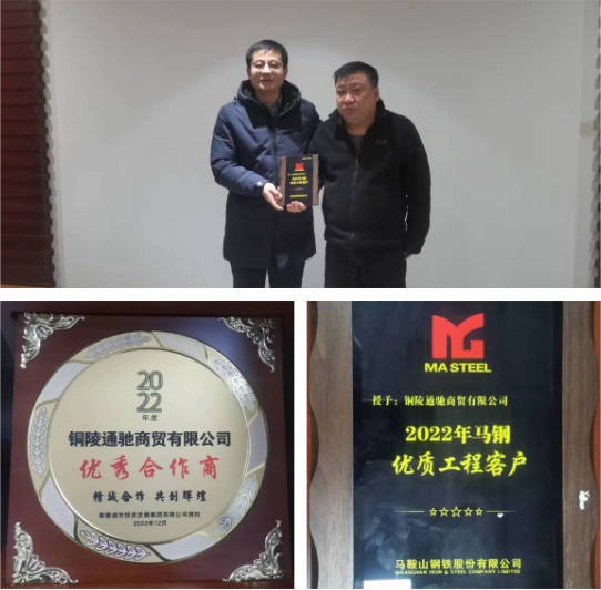2023年2月10日,通馳商貿(mào)公司憑借精質(zhì)的服務(wù)在眾多供應(yīng)商中脫穎而出,榮獲馬鋼公司2022年度“優(yōu)質(zhì)工程客戶”稱號(hào)。馬鋼公司營銷中心市場(chǎng)分析師、首席營銷師夏仕卿特赴公司現(xiàn)場(chǎng)授牌并調(diào)研相關(guān)工作。