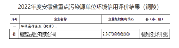 10月9日,市生態(tài)環(huán)境局對2022年度“安徽省重點污染源單位環(huán)境信用等級評價結果”予以公布,市交投集團司屬堅益鋁業(yè)公司經(jīng)過層層評選,成功榮獲“環(huán)保誠信企業(yè)”稱號。據(jù)悉獲評該項榮譽我市共計92家企業(yè)。