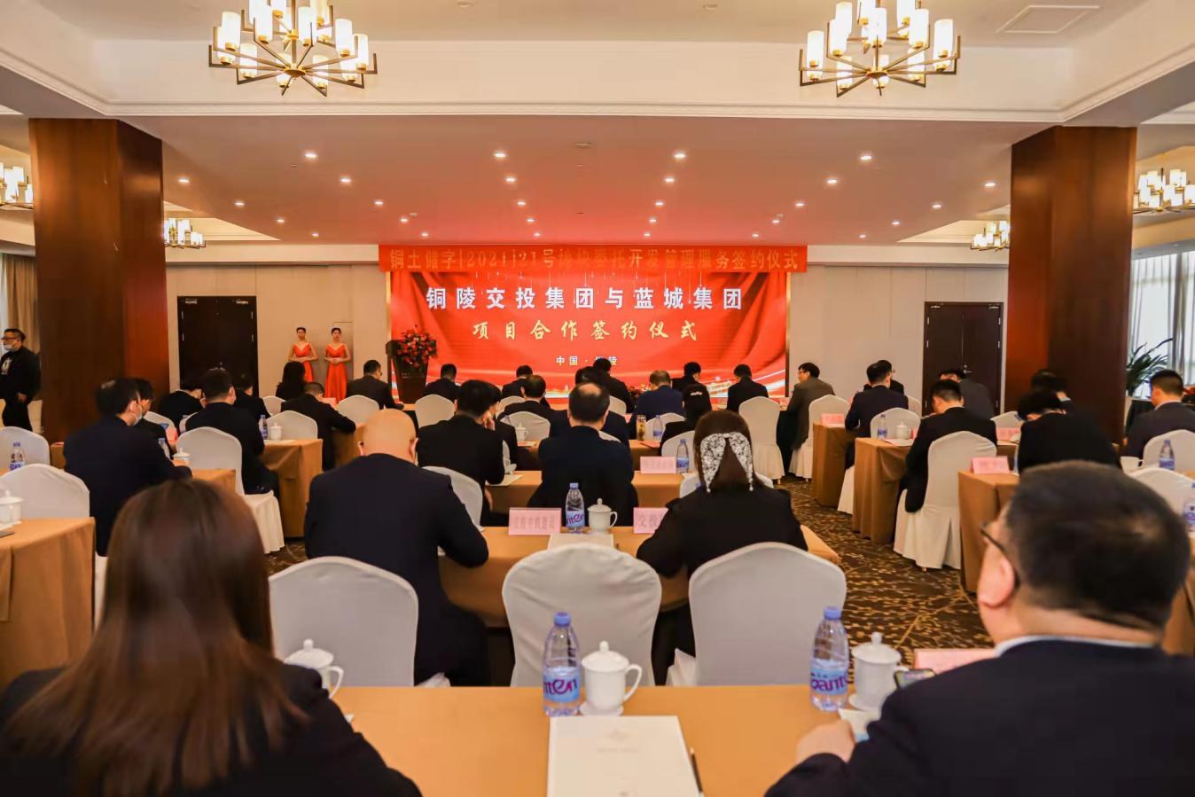 3月12日上午,銅陵交投置業與藍城偉業控股有限公司于銅雀臺酒店,正式完成銅土儲字【2021】21號地塊(綠源地塊)委托開發管理服務簽約。本次會議由銅官區政府副區長——劉宬主持,銅陵市招商服務中心、市住房和城鄉建設局、市自然資源和規劃局、招商服務中心、銅官區政府相關部門領導,以及銅陵交投、藍城集團領導共同出席了本次簽約儀式。