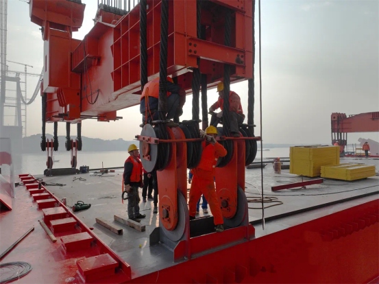 世界首座雙層斜拉-懸索協(xié)作體系大橋,主跨988米。主橋鋼梁采用直桁斷面和三角桁布置形式,分為斜拉區(qū)段、懸吊區(qū)段、斜拉懸吊交叉區(qū)段三部分。鋼梁受力體系不同,剛度差異大,線型控制及合龍難度大。全橋鋼梁共計6.66萬噸,分為59個節(jié)段,最大節(jié)段重量約1600噸。此次架設的鋼梁是邊跨Z0-Z1節(jié)段,長14米,桁寬35米、桁高13.5米,重達1230噸。