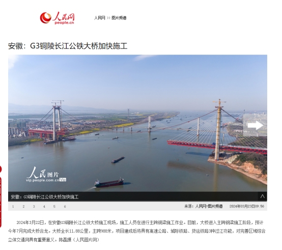 3月22日,人民網報道由銅陵交投集團投資建設、中鐵大橋局承建的G3銅陵長江公鐵大橋項目建設進展情況,具體原文如下: