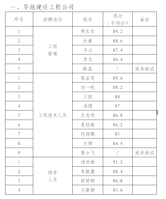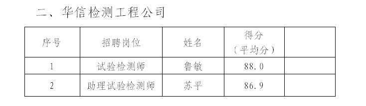 根據(jù)《銅陵華越建設(shè)工程有限公司公開招聘人員公告》、《銅陵市華信工程質(zhì)量檢驗有限責任公司公開招聘人員公告》,于3月1日開展招聘人員面試工作,現(xiàn)將擬招錄人員公示如下: