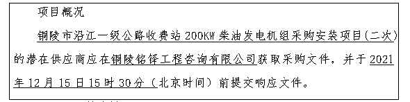 采購需求:銅陵市沿江一級公路收費(fèi)站200KW柴油發(fā)電機(jī)組采購安裝項目,具體詳見項目需求。