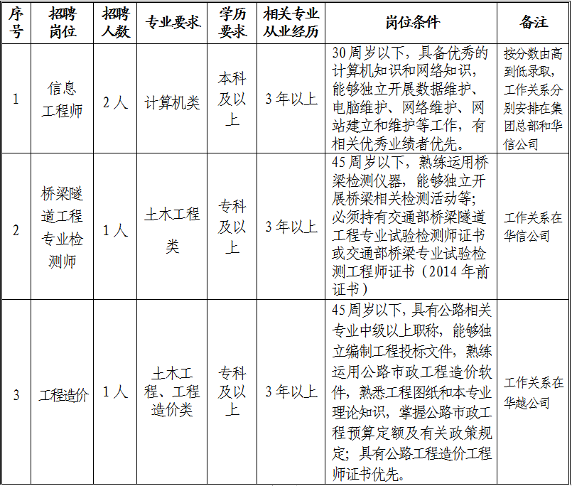 2.報名方式:采取網(wǎng)上投遞簡歷方式報名,凡有意應(yīng)聘上述招聘崗位且符合崗位要求的人員,請將報名表、個人簡歷、有關(guān)證件掃描件(學(xué)歷證書、職稱證書、職(執(zhí))業(yè)證書、身份證等)發(fā)至報名郵箱:4060356@qq.com,或郵寄地址:銅陵市北京北斗星城3-C6C7棟1102號(銅陵市綜合交通投資集團(tuán)有限公司收)。