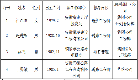 根據(jù)《銅陵市交通投資有限責(zé)任公司招聘人員公告》,現(xiàn)將道路工程師、造價(jià)工程師、項(xiàng)目管理擬聘用人員名單公示如下: