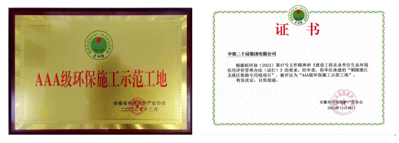 日前,從安徽省環境保護產業協會傳來佳訊,銅陵港江北港區鐵路專用線項目中鐵二十局施工管段喜獲安徽省2023年度“AAA級環保施工示范工地”榮譽稱號。