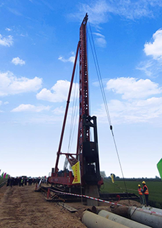4月20日上午,江北港鐵路專用線跨國道G347特大橋施工現場,全線第一根預應力高強混凝土管樁(簡稱PHC管樁)試樁成功。